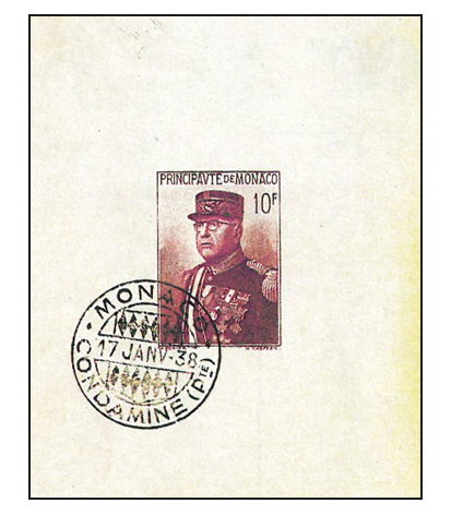 Une présentation très spéciale à ajouter aux deux tirages usuels (papier blanc épais et papier gris mince) et aux épreuves de luxe. Car c’est ce bloc « Louis II » qui a inauguré, pour la France, Monaco et l’Union française, la longue lignée des oblitérations grand format Illustrées. Trois cachets utilisés : Monaco, Monte-Carlo et Monaco Condamine. Le troisième (reproduit ici) est le plus rare.