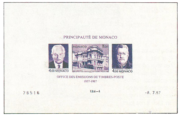 Le bloc du cinquantenaire de l’Office des timbres monégasques est, bien sûr, connu pour son tirage limité de non dentelés (100 000 exemplaires contre 200 000 dentelés).Mais il a donné lieu aussi à une très faible quantité d’essais de couleur (ici: fond mauve à la place du noir), sur feuillets gommés, datés, portant le numéro de la presse (TD6-6) et un numéro de feuille.