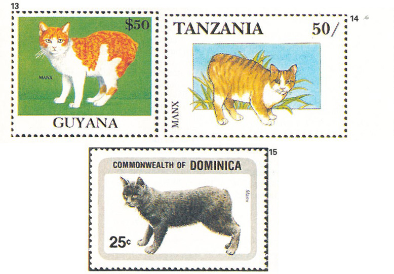 Une autre particularité du manx lui confère une silhouette particulière : les pattes postérieures sont plus longues que les antérieures, ce qui lui donne l’allure : d’un lapin. Un club a été créé en 1901, et bien que la reproduction du manx soit limitée afin de contrôler les risques de consanguinité, les amateurs peuvent désormais en obtenir. Depuis les années 50 existent des manx à poils longs. ils sont apparus au Canada dans une portée, et les éleveurs ont croisé ces chats « mutants » entre eux pour que cette caractéristique devienne héréditaire. On donne à ces cousins des manx le nom de kimrique (16), qui signifie « gallois » en celtique, pour rappeler son origine. L’île de Man est si fière de son chat qu’elle a émis un premier timbre le représentant dès 1973, année de son indépendance postale, suivis d’autres en 1978 et 1989, et elle a frappé une monnaie à son effigie.